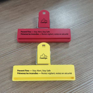 These durable, reusable bag clips feature a bold fire prevention message to raise awareness where it matters most—at home, in the kitchen.