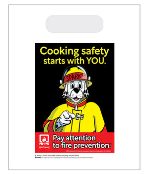 These Fire Prevention Week™ (FPW™) Bags are a colourful way to hand out cooking safety educational materials as prizes and giveaways throughout the year. They feature Sparky the Fire Dog®. Promoting the phrase, “Cooking safety starts with YOU. Pay attention to fire prevention™,” these bags can be filled with tons of fun fire prevention products, such as:
