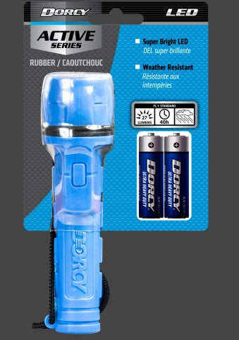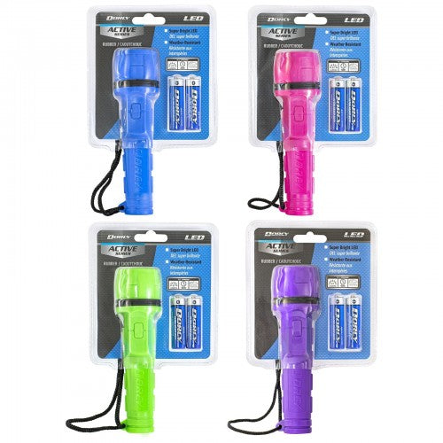 La lampe de poche LED en caoutchouc produit 40 lumens de lumière et fonctionne avec 2 piles AA (incluses). La lumière est disponible en 4 couleurs différentes (bleu, rose, vert et violet) et comprend une lanière pratique Construction en caoutchouc Lanière incluse Résistant aux...